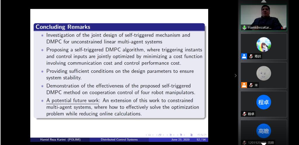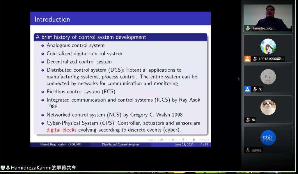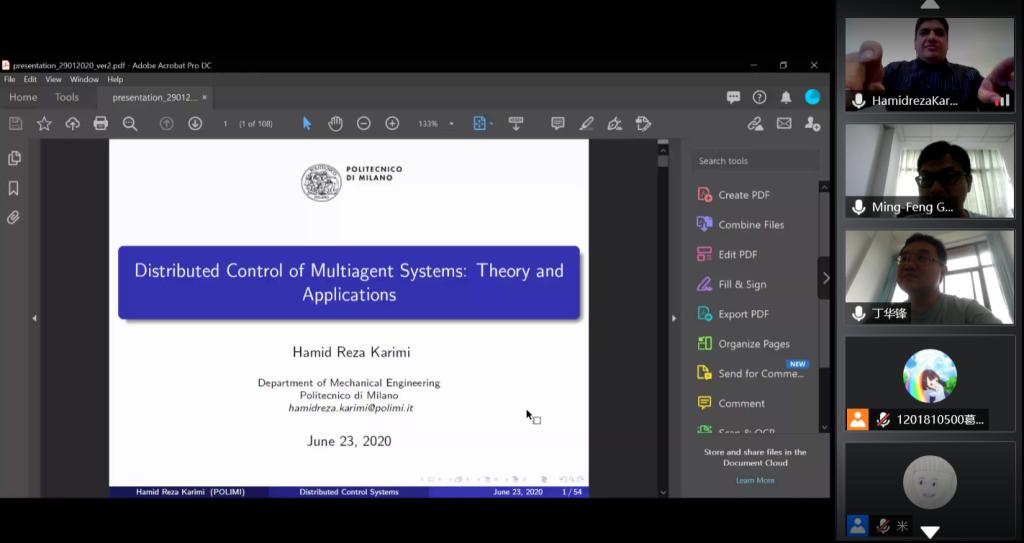 应yl23411永利集团官网院长丁华锋教授邀请,意大利米兰理工大学Hamid Reza Karim教授于6月23日通过线上会议来我校作题为Distribute Control of Mult iagent System:Theory and Applications的学术报告。报告会由葛明峰老师主持,永利官网罗杰副院长、李敏、雷波、王玉丹等老师以及研究生均出席了报告会。