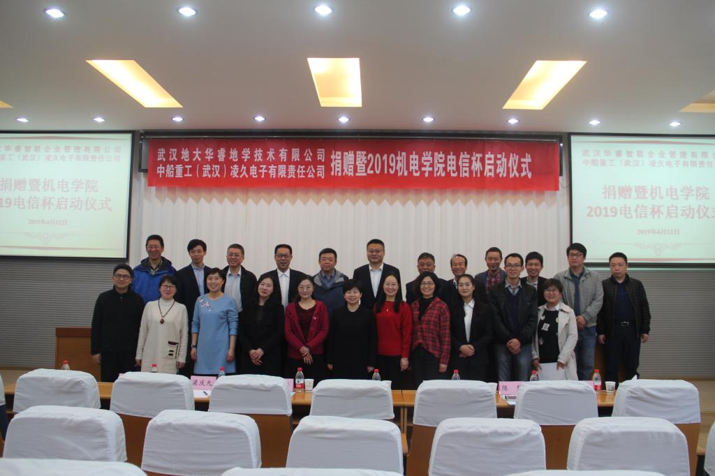 (通讯员张祥莉/陈芮/罗大鹏)2019年4月12日上午10时,武汉华睿智联企业管理有限公司、中船重工(武汉)凌久电子有限责任公司捐赠暨2019yl23411永利集团官网电信杯启动仪式于教二楼301隆重举行。参与本次会议的电信杯历届赞助企业有:武汉华睿智联企业管理有限公司、中船重工(武汉)凌久电子有限责任公司、武汉鸿志高测电气技术有限公司;教育部产学研协同育人项目企业有:武汉易思达科技有限公司,武汉光庭信息技术股份有限公司,中智讯(武汉)科技有限公司,武汉凌特电子技术有限公司及其他合作企业;校内院系及职能部门有:yl23411永利集团官网、教育发展基金会、资产公司、教务处、学生就业创业指导处等。yl23411永利集团官网院党委副书记于晓舟担任主持人。