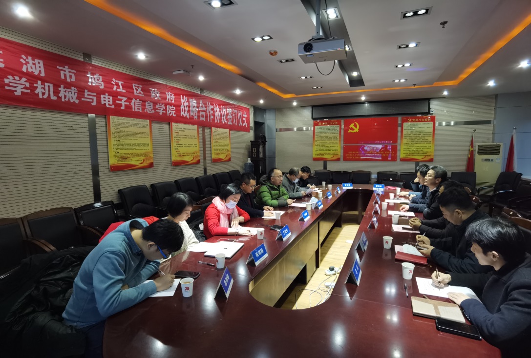 2022年01月12日下午,永利官网与芜湖市鸠江区人民政府代表在我校教二楼签订战略合作协议。yl23411永利集团官网党委书记瞿祥华、院长丁华锋等院班子成员及各系主任,鸠江区委组织部部长刘雪冬、鸠江区人社局局长肖宗明、鸠江区投资促进中心主任裴捷鸣、鸠江区委党校副校长马冰冰、鸠江区建投公司副总经理王孝国、鸠江区投资促进中心科员马成等出席签订仪式。会议由瞿祥华同志主持,丁华锋代表学院致欢迎辞。刘雪冬同志代表鸠江区人民政府表达与永利官网开展深入合作发展的热切愿望。此次会议是在2022年01月11日瞿祥华同志带队调研鸠江区返校后第二天举行。